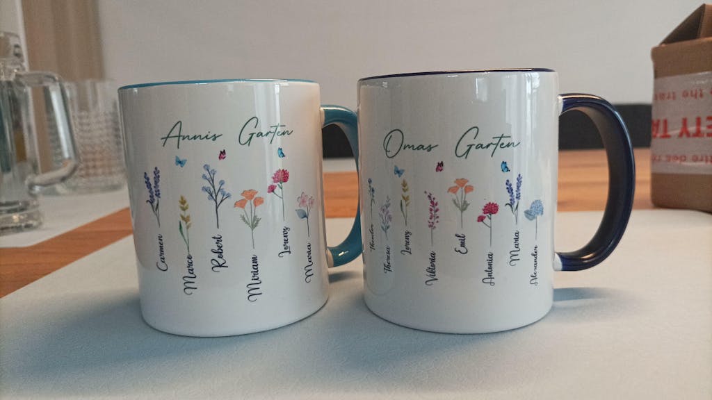 Ich habe zwei Tassen, zweifarbig und mit sechs und acht Namen, bestellt. Die beschenkten Omas hatten tatsächlich Tränen in den Augen, vor lauter Rührung. Ich liebe die Blumen, sie sind so zauberhaft illustriert. Die Tassen sind genauso wunderbar, wie ich gehofft habe. Am 1. habe ich bestellt, und am 12. sind sie angekommen.