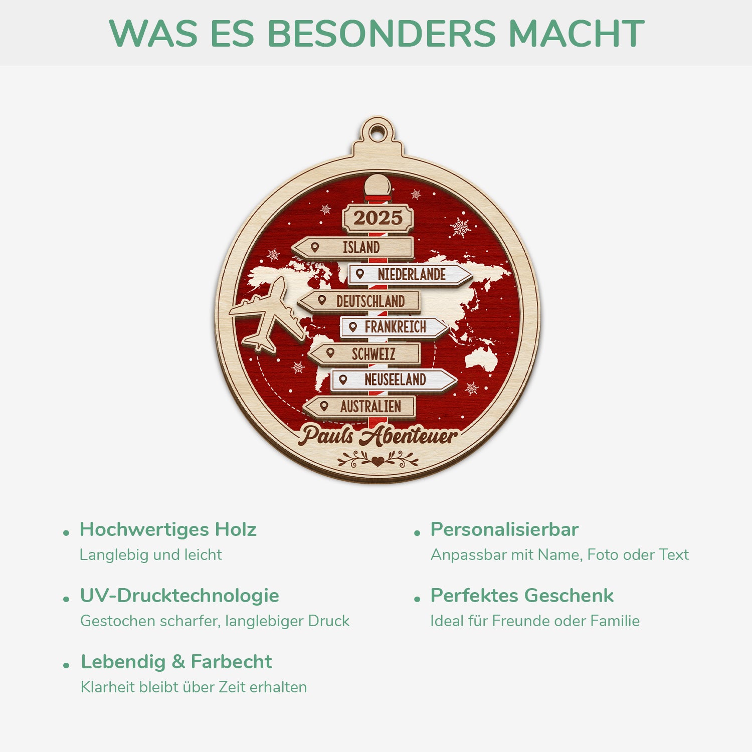 Abenteuer Straßenschilder - Personalisierte 2-Schicht-Holz-Ornamente Weihnachten Reisen