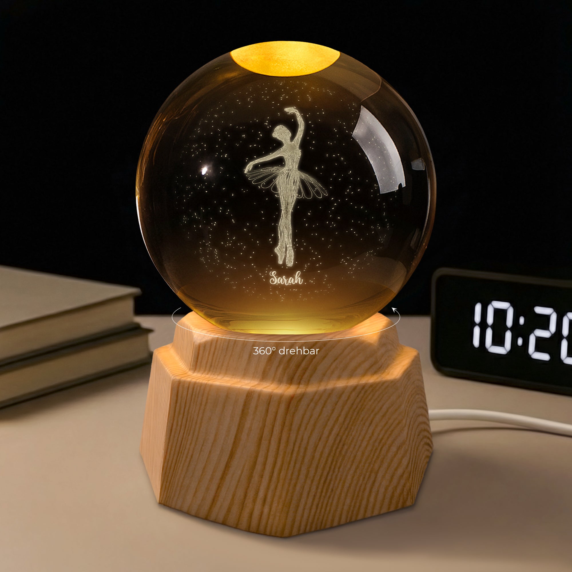 - Material: K9-Kristall & drehbare LED-Holzbasis.