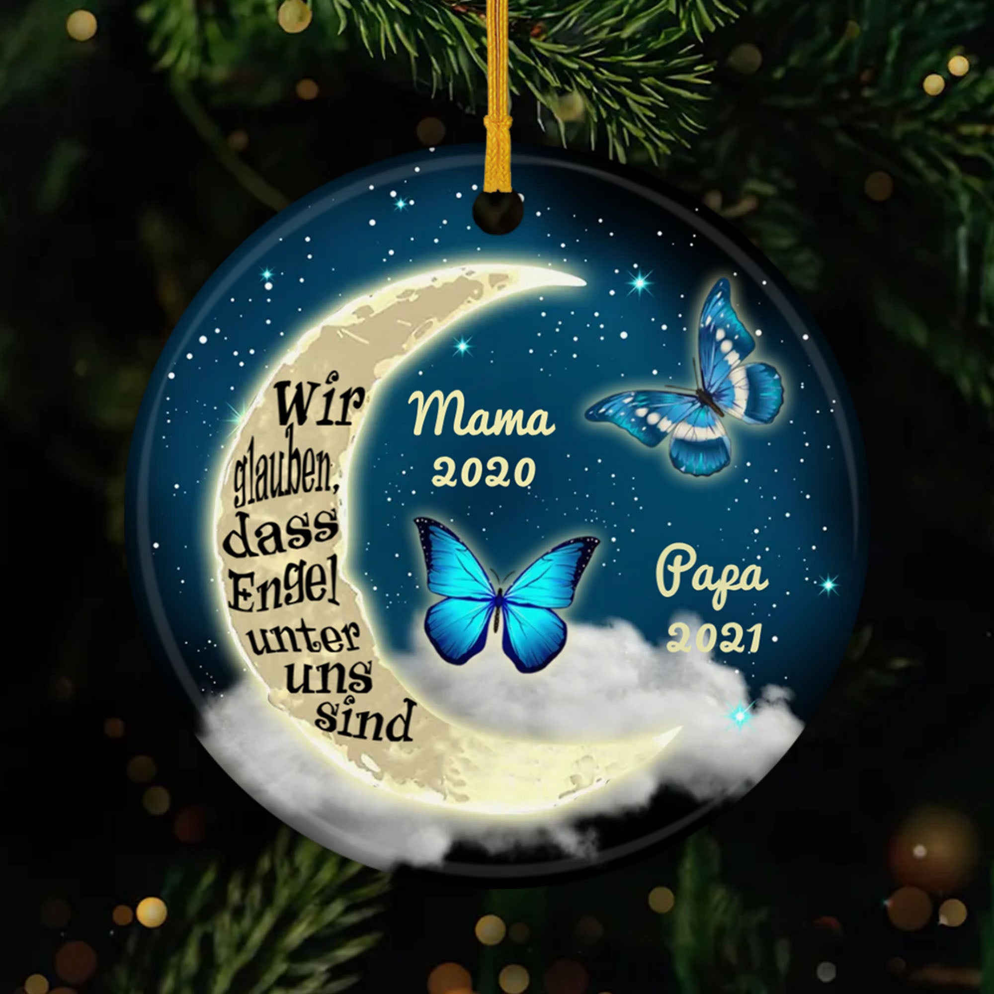 Dieses Design mit Mond und blauen Schmetterlingen trägt die Botschaft „Wir glauben, dass Engel unter uns sind“. Als Gedenk Ornament wird es zu einem liebevollen Symbol für Mama, Papa oder andere geliebte Menschen, die im Himmel sind. Perfekt als Memorial Geschenk Weihnachten, wenn man Nähe und Hoffnung spüren möchte.