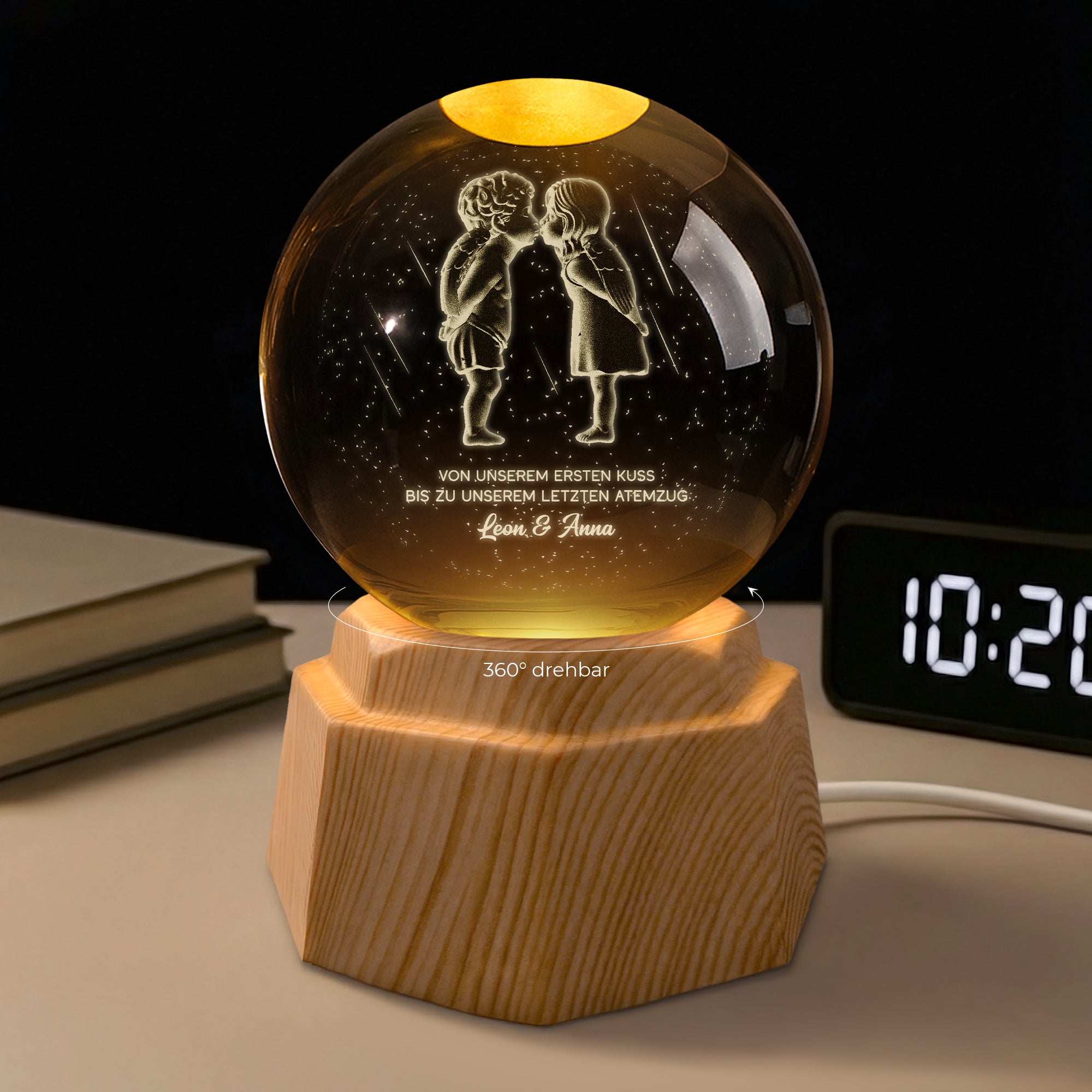 - Stimmungsvolles Licht mit Bedeutung: Die leuchtende Kristallkugel sorgt für eine warme, beruhigende Atmosphäre. In Kombination mit der sanft rotierenden Kunststoff-Basis wird jedes gravierte Motiv eindrucksvoll in Szene gesetzt.
