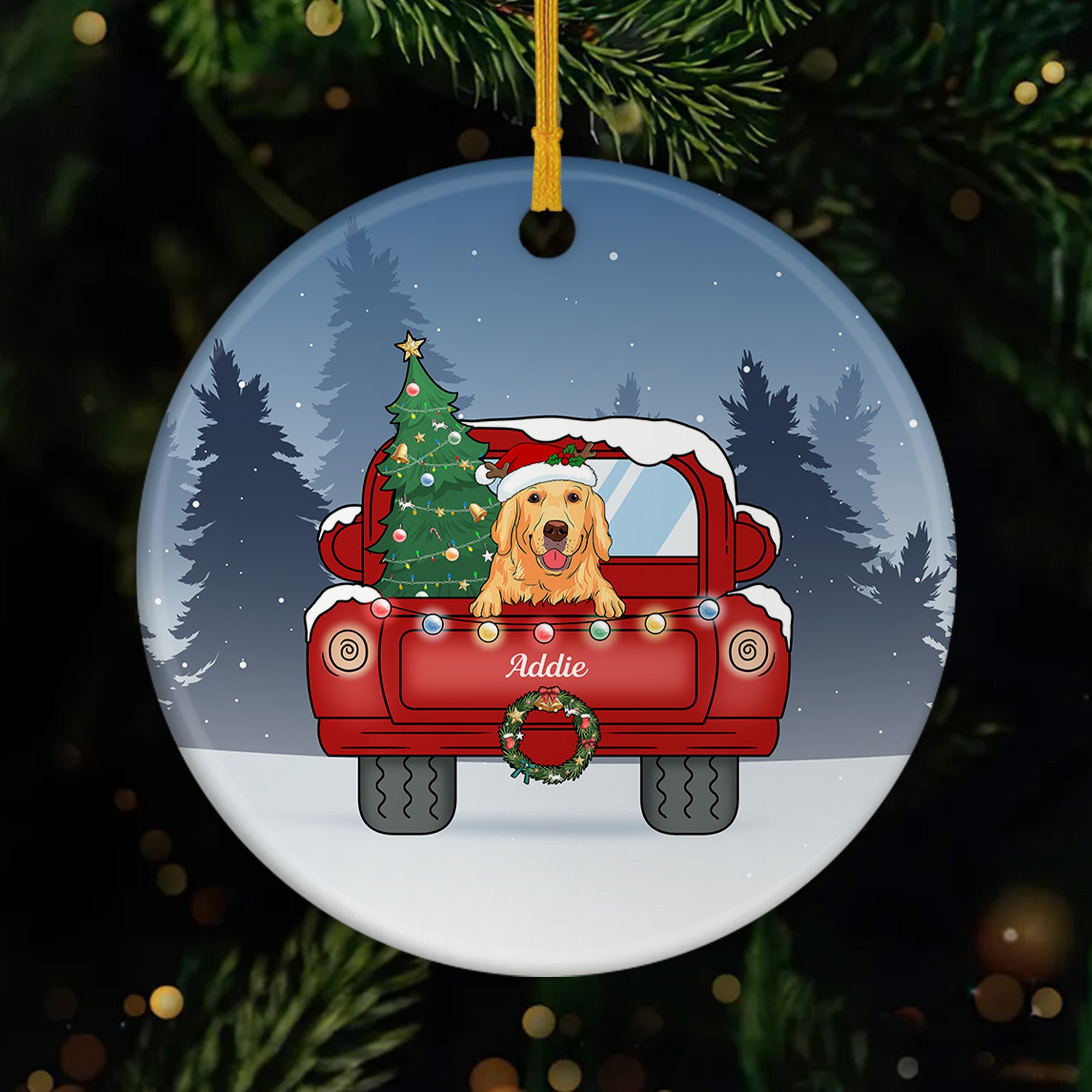 Dieser personalisierter Weihnachtsschmuck zeigt deinen Hund auf einem winterlichen Motiv mit rotem Auto und Tannenbaum – ein echtes Highlight der Feiertage. Mit Namen personalisiert, wird er zu einer bleibenden Erinnerung an eure schönsten gemeinsamen Weihnachten.